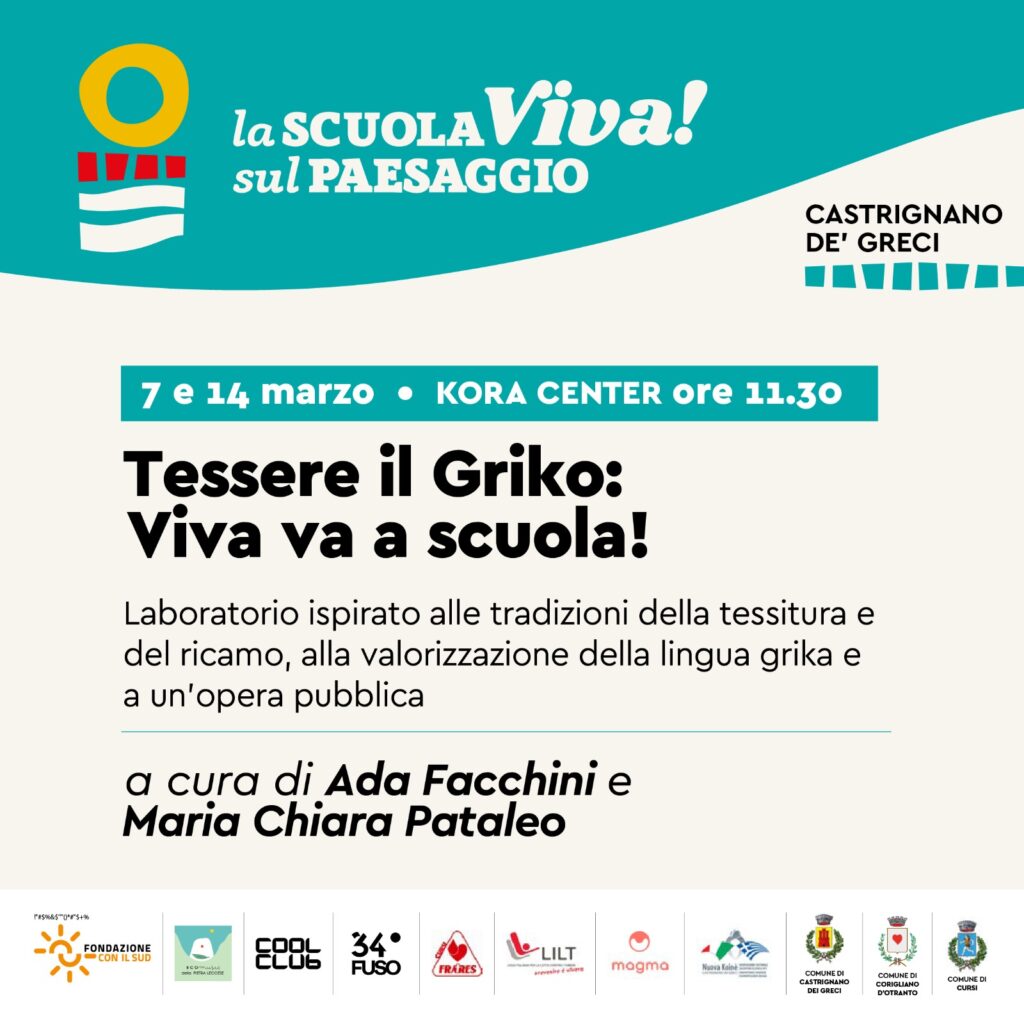 Per la Scuola sul Paesaggio di VIVA – Tante belle cose, giovedì 7 marzo e a seguire il 14 marzo, con la classe IV della Scuola Primaria di Castrignano de’ Greci, si svolgerà TESSERE IL GRIKO, un laboratorio ispirato alle tradizioni della tessitura e del ricamo, alla valorizzazione della lingua Grika e a un’opera pubblica collettiva a cura dell’artista Muna Mussie e di prossima realizzazione a Castrignano de’ Greci – Borgo del Contemporaneo.